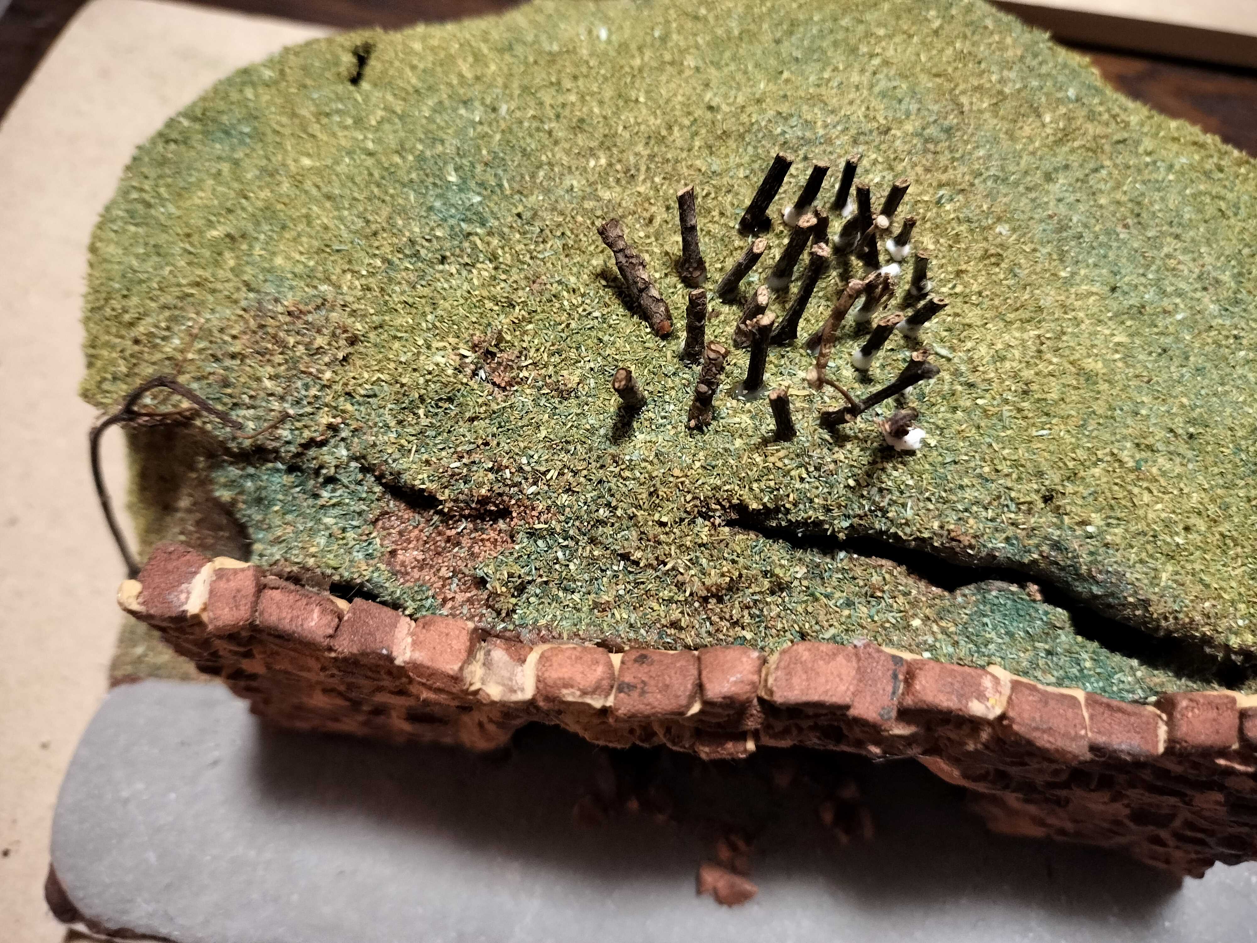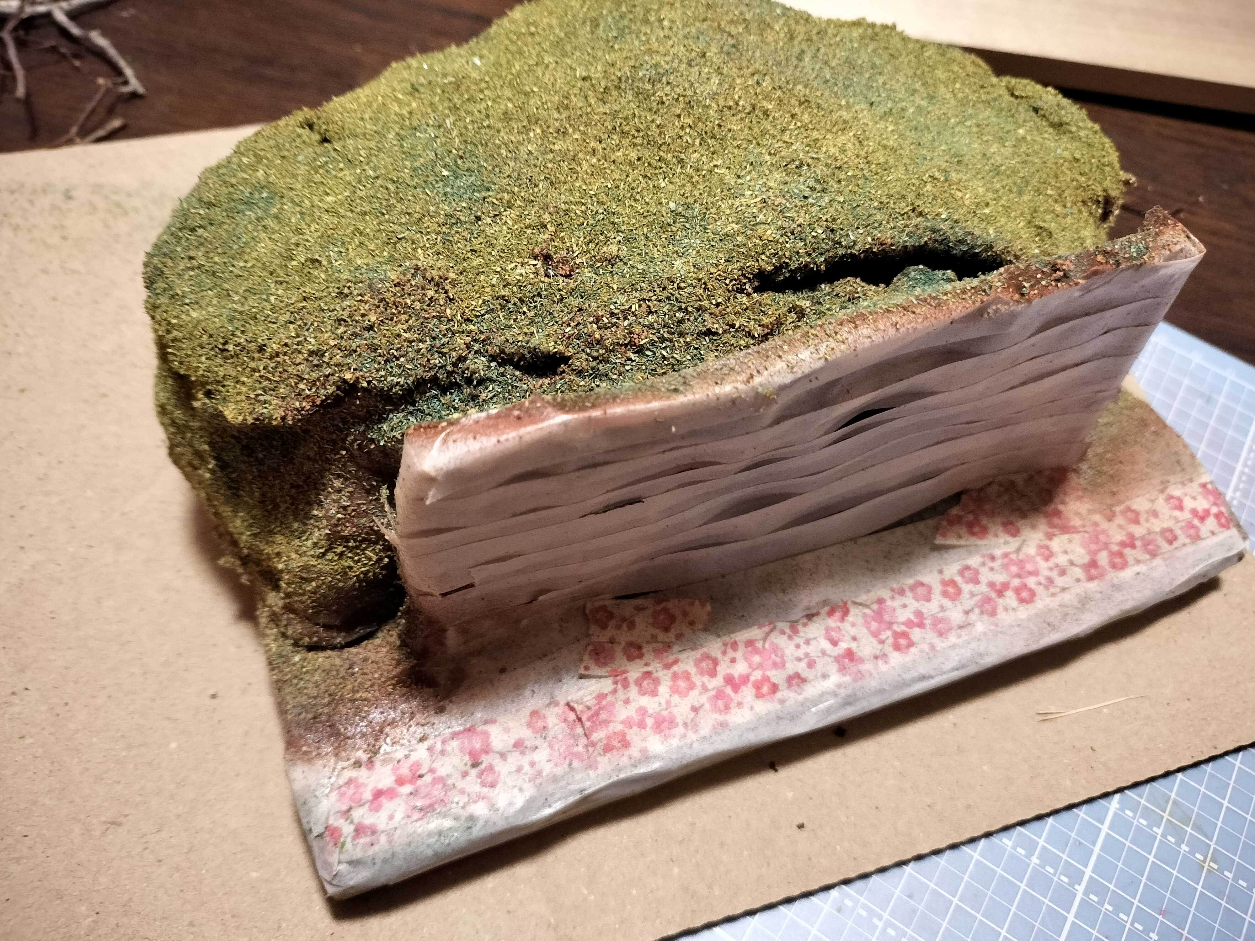 茶色のラッカースプレーで色を付け、緑と黄緑の砂を振りかける。